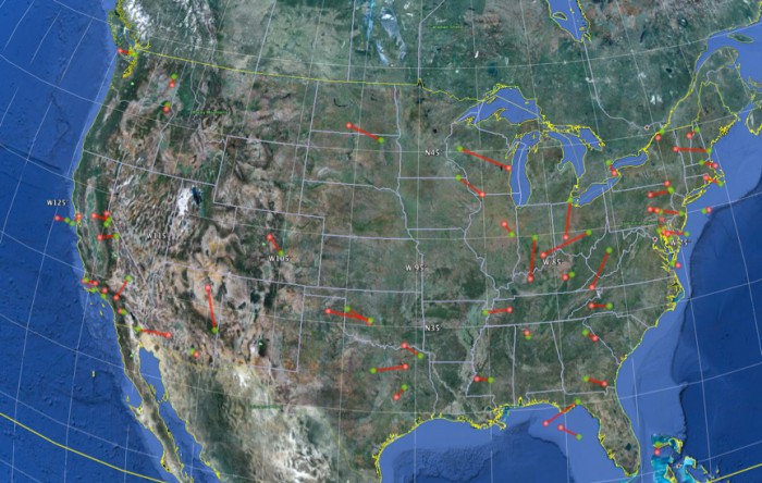 A Google Earth KML file containing the estimated trajectories of the significant AMS events from 2005-2013 can be download here: Trajectory Estimates for Significant AMS Events 2005-2013. (KML file provided in zip format and must be unzipped. File can only be used with Google Earth. You can download Google Earth for free here.