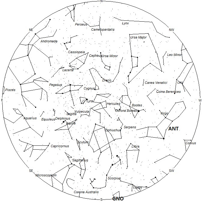 The center of the large Anthelion (ANT) radiant is currently located at 12:56 (194) -06. This position lies in central Virgo, 5 degrees southwest of the famous 3rd magnitude double star known as Porrima (Gamma Virginis). Due to the large size of this radiant, Anthelion activity may also appear from Corvus, Crater, eastern Leo as well as Virgo. This radiant is best placed near 0100 LDT, when it lies on the meridian and is located highest in the sky. Rates at this time should be near 2 per hour no matter your location. With an entry velocity of 30 km/sec., the average Anthelion meteor would be of slow velocity.