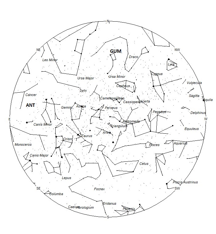The Anthelion (ANT) radiant is active from a position located at 08:08 (122) +20. This position lies in western Cancer, 8 degrees northwest of the 4th magnitude star known as Asellus Australis (delta Cancri). This radiant is a very large oval some thirty degrees wide by fifteen degrees high. Activity from this radiant can appear from more than one constellation., Anthelion activity may also appear from Gemini as well as Cancer. There are several lists that have the delta Cancrids currently active, but we include them with the Anthelions as the celestial positions overlap. The position listed here is for the center of the radiant. This radiant is best placed near 01:00 Local Standard Time (LST) when it lies on the meridian and is highest in the sky. Rates at this time should be near 3 per hour as seen from the northern hemisphere and 2 per hour as seen from south of the equator. With an entry velocity of 30 km/sec., the average Anthelion meteor would be of slow velocity.