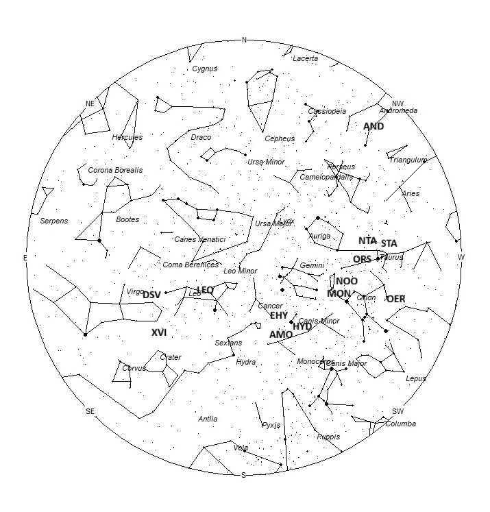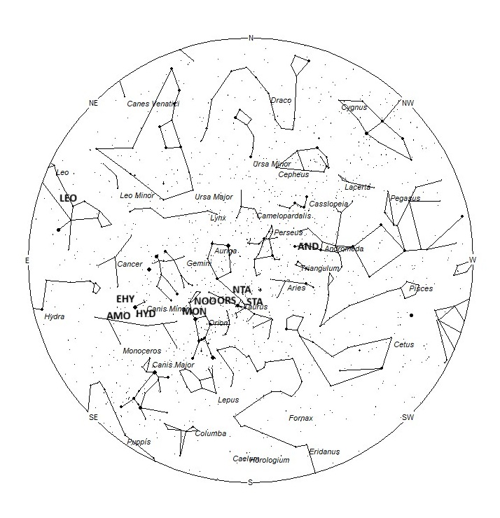The eta Hydrids (EHY) are active from November 22 through December 31, with maximum activity occurring on December 8th. The radiant is currently located at 08:00 (120) +05. This area of the sky lies on eastern Canis Minor, 4 degrees east of the zero-magnitude star known as Procyon (alpha Canis Minoris A). This radiant is best placed near 0400 LST, when it lies highest above the southern horizon. Rates should be less than 1 no matter your location. With an entry velocity of 63 km/sec., most activity from this radiant would be of appear swift.