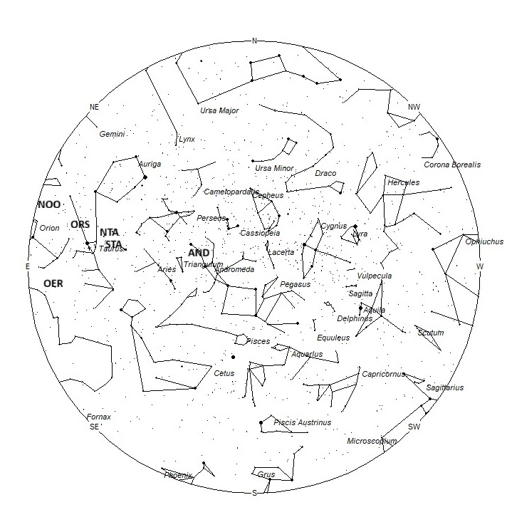 The Andromedids (AND) are the annual debris encountered from the remains of comet 3D/Biela. These meteors should not be mistaken for the great meteor storms of the 19th century as those meteors are in a slightly different orbit and irregularly encountered in early December. They are known as the December phi Cassiopeiids (DPC). It is interesting that during November, this radiant moves northward toward the area of the DPC’s but ends before reaching the DPC radiant. The radiant currently is located near 01:32 (025) +39. This position lies in southeastern Andromeda, 5 degrees northeast of the 2nd magnitude star known as Mirach (beta Andromedae). This part of the sky is best placed near 23:00 (LST), when the radiant lies highest in the southern sky. Current rates would most likely be less than 1 per hour no matter your location. With an entry velocity of 15 km/sec., the average Andromedid meteor would be of slow velocity.